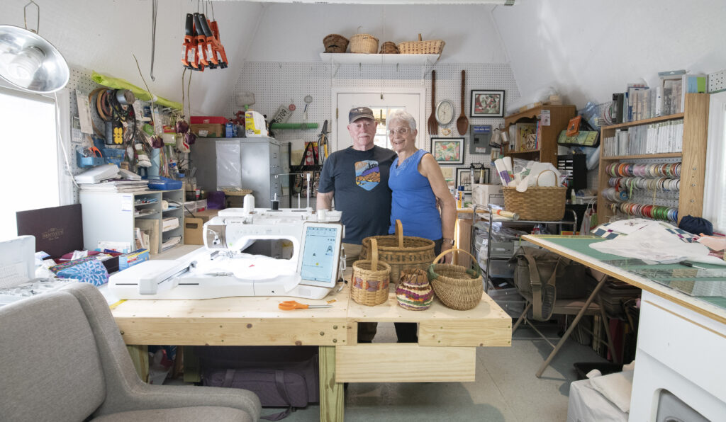 Since retiring in 2007, Joyce has filled her days – and her she shed – with quilting, paper crafting, embroidery, and basket weaving. The space is alive with color and texture, from delicate Nantucket baskets woven with reeds to embroidery designs stitched on her sewing machines.